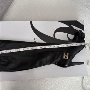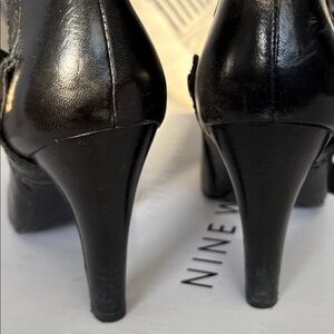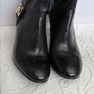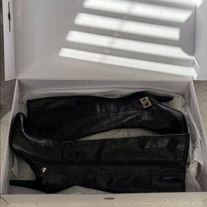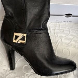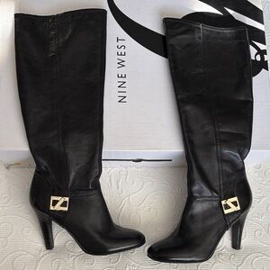 Nine West knee-high leather boots in black with a gold-toned buckle detail.