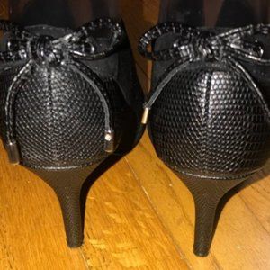 >Black suede peep toe booties with a stylish bow detail on the back ankle