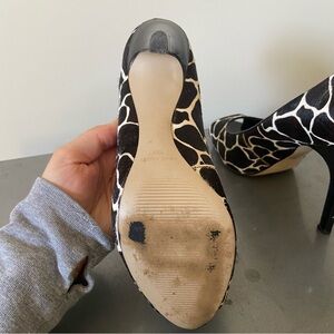 Stylish Nine West heels with bold faux fur giraffe print. Peep toe design. Perfect for a fashionable look.