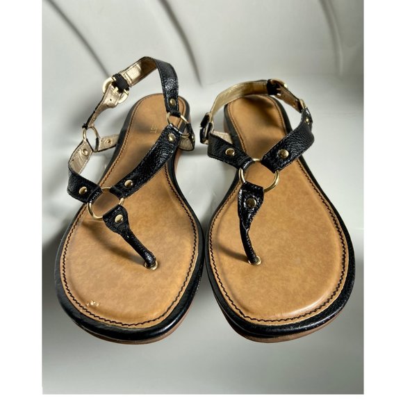 Nine West Black with Gold Hardware T-Strap Flat Sandals