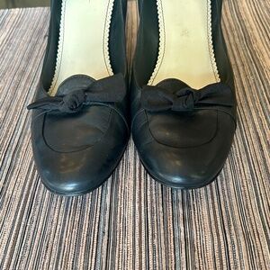These Nine West black leather high heels are an ideal addition to any wardrobe due. They have a closed toe with a black fabric bow across the tops. The heels are 3.75” in height. These heels are versatile and can be dressed up or down. They are also an excellent choice for work. They are size 10. These heels are in excellent condition. They were worn a couple of times.