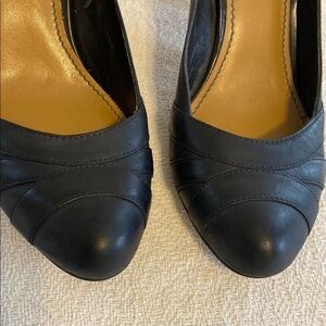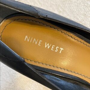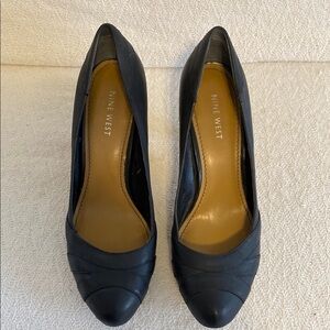 Nine West Black Leather Wood Cone Heel Pumps Career Minimalist Round Toe Closed