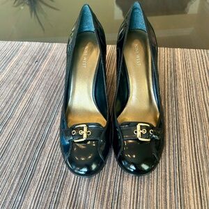 Nine West Black Patent Leather High Heels with Round Toe & Gold Buckle 10