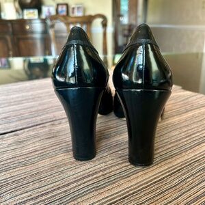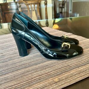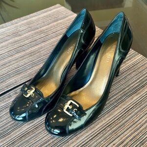 These Nine West black patent leather high heels are adorable. They have a round closed toe. The top of the shoe has a gold buckle. The block heels add comfort and stability, making these shoes easy to stand and walk in. The heel height is 4”. These high heel shoes are a great staple in any wardrobe due to their versatility. They are in excellent condition.