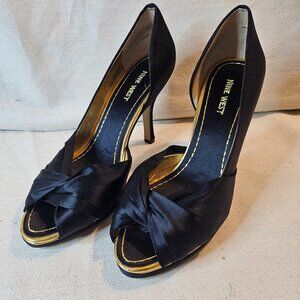 Open toe pumps with an elegant bow design. Gold stitching and gold lining.
