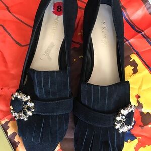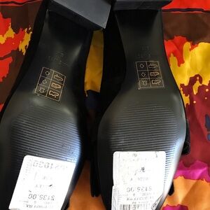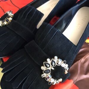 Elegant black suede loafers. Features a decorative buckle. Perfect for any occasion.