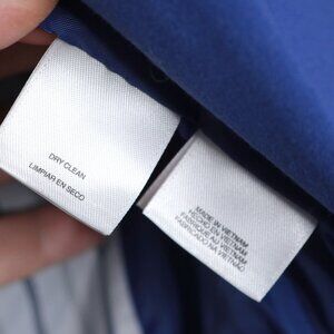 The Nine West Blue Blazer Jacket is a stylish choice for office workwear. This jacket is designed in a smart single-breasted, one button closure style and is lined for extra comfort. It features black buttons and has a unique striped lining that adds a nice touch. There are also faux zipper pockets, giving it a modern look. This blazer is perfect for creating a professional outfit while still feeling casual and relaxed.