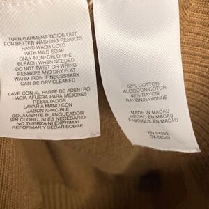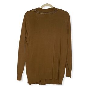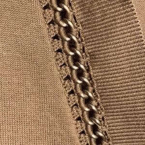 Love this sweater. I wore it for an oversized look. Stunning chain detailing made me think of Chanel. Colour is a camel shade. Really nice. Excellent condition. Size 1X but I’m a medium and wore it as an oversized sweater. Excellent condition with minor signs of wear. See photos for condition and measurements.