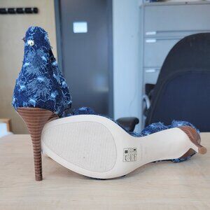 Don't strive to look like the average girl in heels, add a rough edge of rebellion and walk with confidence with these Nine West Heels. With the appeal of a distressed denim gives somewhat a gritty look as well as an unique texture outlook. With the colour of the heels being a dark blue and dark brown, one can utilize them in their wardrobe as they would a dark denim jeans with the brown stitching which is ocmmonly used in everyday fashion. Features five holes for adjustability on the ankle strap.