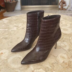 Nine West Fhayla Stiletto Heel Booties Croc Embossed Faux Leather Dark Brown