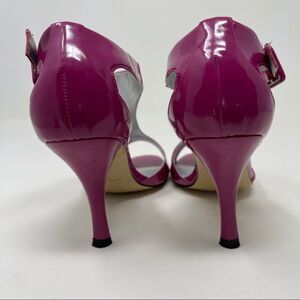 Gently used-small wear mark on front of right toe-please see photos. Nine West Jendavio Magenta patent synthetic leather. T-Strap Stiletto Heeled Sandal. Adjustable ankle strap with buckle.