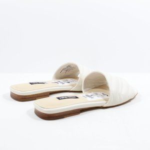 Walk a fine line between casual style and elegance with these women's Nine West Mends chic cream flat sandals. Designed with an open square toe, these slide sandals come with quilted synthetic vamp strap with chevron pattern stitching, slip-on design, synthetic lining, soft footbed with NINE WEST label, low block heel and sleek synthetic sole.