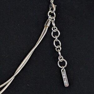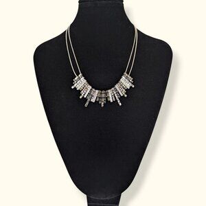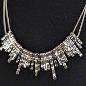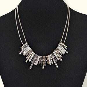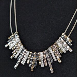 This necklace by Nine West has two snake chains made of a silver tone metal and an adjustable lobster clasp closure with a maker's tag stamped "Nine West". The necklace features several bendy/wavy rectangular "pins" made of various metal tones and in different lengths. Some of the links are rectangular and flat, and are accented by small white/clear rhinestones. The necklace has normal wear, including some cloudiness and superficial marks in the metal pins, but the piece is still very wearable.