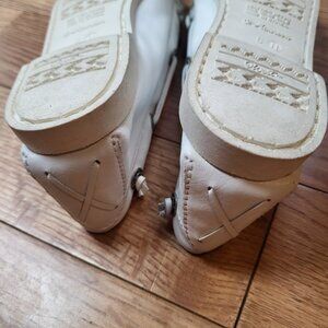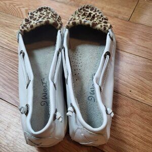 The shoes are white with a leopard print design on the front. "9 West" is printed on the inner sole of each shoe.