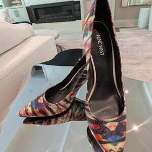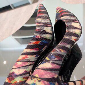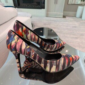Awesome 80's and 90's inspired multicolor striped pumps from Nine West. Excellent condition. Synthetic upper and lining, looks and feels like leather. Four-inch heel. Size 9 1/2. PLUS matching clutch with optional shoulder chain strap, measures 8inches by 12.5 inches. Excellent condition, like new. Must be sold as a set