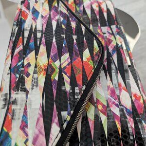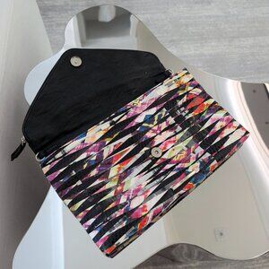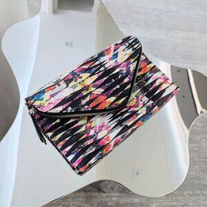 Awesome 80's and 90's inspired Nine West multicolor striped printed clutch featuring optional shoulder strap, with matching 4-inch heels, size 9.5 Synthetic material, looks and feels like leather. Excellent condition, like new. Sold as a set, shoes and bag. Bag measures 8 inches by 12.5 inches.