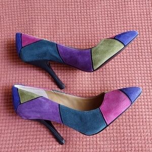 Nine West Multi-coloured Suede High Heel Shoes. Size 8M. NW Boogie Down. Leather textile upper. Purple, blue, forest green, pink and teal with black heel. Heel is 4" high. Clean soles. Never worn. Excellent condition.