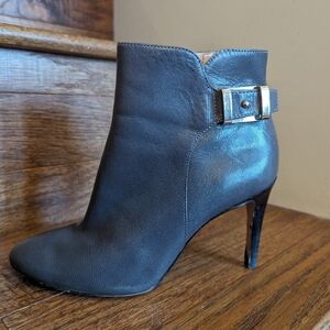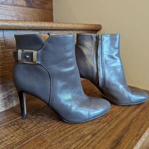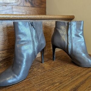 Nine West Palafox gray stiletto heel ankle boot, Size 5.5. Worn lightly a few times, trace wear and mild crease to leather. No wear to insole. Heel has some black discolouration on the back of the heel. Heel is 3.5" tall