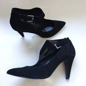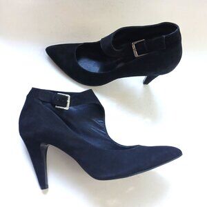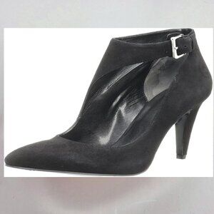 Nine West Peppy Asymmetrical Mid Heel Buckle Ankle Closure Black Suede Booties