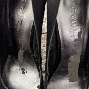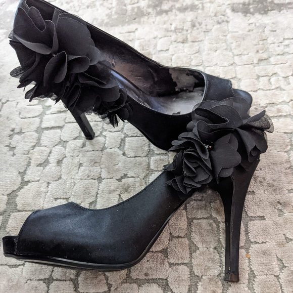 Black satin open toe pumps with floral detail on heel. Great condition except for a bit of wear inside the shoe.