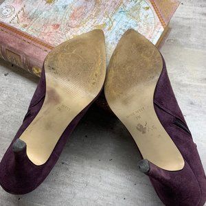 Beautiful soft grape purple bootie by Nine West. These are slightly worn and soles show slight wear. Heels, heel tips, outer suede upper fabric are all in very good to excellent condition. Insides are also in great condition.