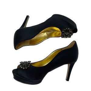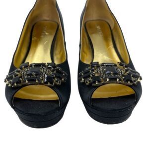 Nine West Avara2 Satin Heel Dress Pump Peep Toe Women's 7 Platform Glitter Bottom Party Shoes. 3.5" heel, 3/4" platform. Embellished with Rhinestones - it looks like one small stone is missing. A bit of wear on the back of the right heel. Gold Glitter on the bottom of the shoes. Very good condition.