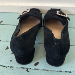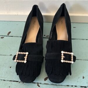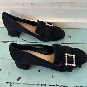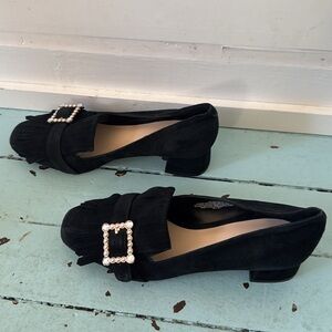 Nine West black canary suede loafers with faux pearl and crystal buckle and fringed vamp. 1.5in block heel. Rounded Square toe. Beautiful and cute !!! This shoe can be dressed up for dinner . Great worn with slacks or skinny pants or jeans.