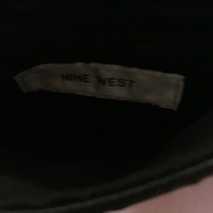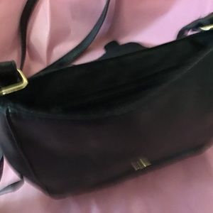 W 6”, H 6”, D 5”; square shape, gold hardware, faux leather exterior, black interior lining, adjustable strap 48”, snap closure