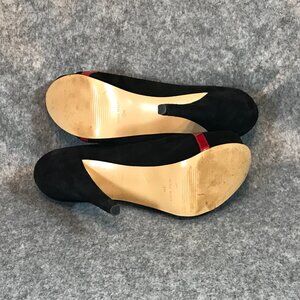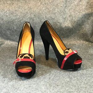 Nine West Women's Black Leather Front Red Strap Leopard Open Toe Heel Shoes