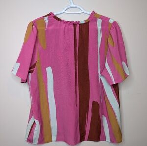 Nine West Women's XL Pink Abstract Print Blouse Top Short Sleeve Boho Flowy