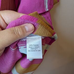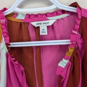 Add a bold pop of color to your wardrobe with this eye-catching Nine West women's top in size XL. Features a relaxed, flowy fit with short sleeves, a flattering V-neckline with tie detail, and a ruffle-trimmed collar. The vibrant pink background is accented with an abstract multicolor stripe pattern in mustard, burgundy, and white tones. Lightweight and breathable — perfect for warm weather or layering. Ideal for casual wear, summer outings, or boho-inspired looks.