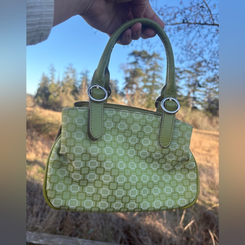 Y2K-era Nine West mini handbag in green with geometric pattern. Structured top-handle style — perfect early-2000s throwback.
