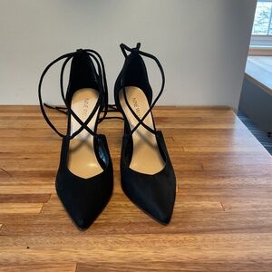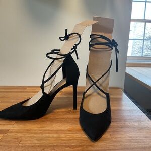 Size 8 Nine West suede shoes with ankle wrap straps and pointy toe. 4 inch high, narrow heel. In very good condition. Some wear on the inside -see photo. But the exterior suede is in perfect condition.