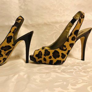 Gorgeous, gently-worn Nine West platform sling back sandals in a leopard print fur. Size 6M (true to size). No box. Cushioned foot beds.