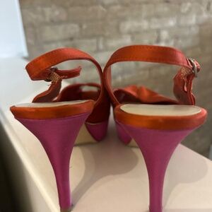 Orange and fuchsia satin heels. Nine West size 8.5. Heel is about 5”. Platform with peep toe. Excellent condition. Super sexy and comfortable because of the platform.
