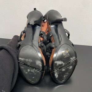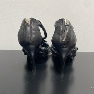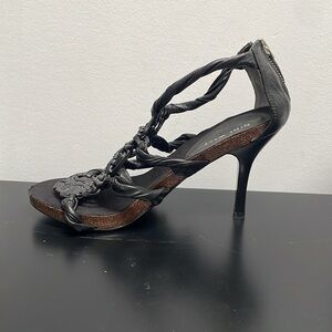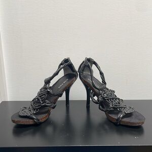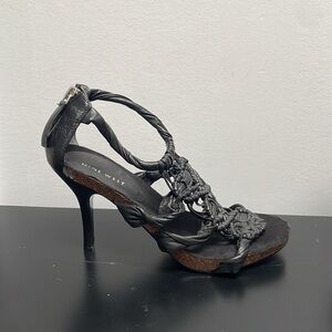 - stiletto heel and a unique, intricately braided design on the upper part, extending from the toe to the ankle strap