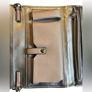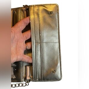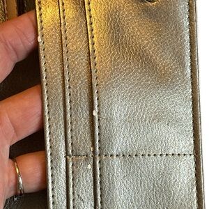 This special occasion bag features a place for your phone (fits an Iphone 14 pro without a case) and lipstick, 9 card slots, one zipper pocket, one slip pocket, and two snaps to keep the bag secure. Gold interior has several minor imperfections (see pics) that could be covered with gold nail polish or paint; they don't affect the use or exterior appearance.