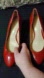 Women's red shoes, used. M width (narrow). There's a couple of water stains on left shoe. More clear in video.