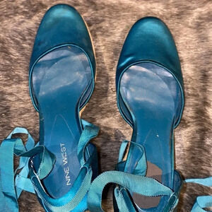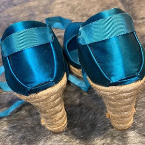 💙stunning dressy casual chic comfy style shoes Nine blue satin espredrille tie wedges size 9 well worn condition missing 2nd sole tag please review all images carefully same day shipping from smoke free home