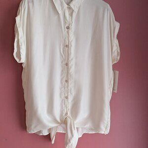 Made from a soft, lightweight fabric in a muted taupe shade, it features a relaxed oversized fit, button-down front, and a single chest pocket for a touch of utility.