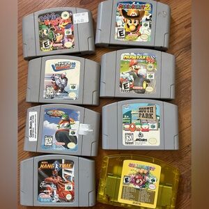 Experience classic gaming with the Nintendo 64 “Jungle Green” console. This set includes a vibrant green console and 4 controllers in blue, atomic blue, atomic purple, and green. As well as 8 cartridges (games). Perfect for nostalgic gamers and collectors.
