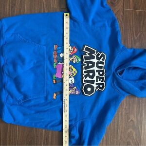 Vibrant blue hoodie featuring Super Mario characters. Perfect for Nintendo enthusiasts.