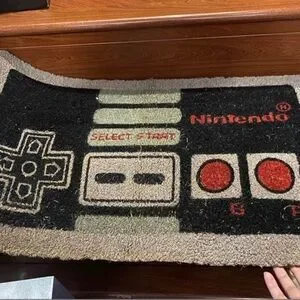 Add a retro touch to your space with this Nintendo controller design rug. Featuring classic black, red, and gray colors, it's perfect for gaming enthusiasts.