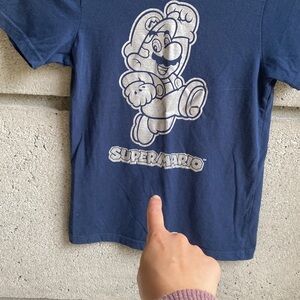Previously worn by my son at Universal Studios. We were so happy we bought all our character shirts here in Canada before going down. Everything in the gift shops was a small fortune. Cute little shirt for Nintendo Mario Bros fans.