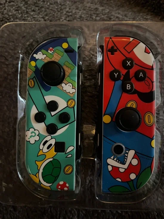 Vibrant blue and red Joy-Con skins with playful cartoon game motifs. Adds personality and style while maintaining full button access. Easy to install and lightweight for everyday gaming. Compatible with standard Joy-Con controllers. Includes blue and red designs for a bold, coordinated look.