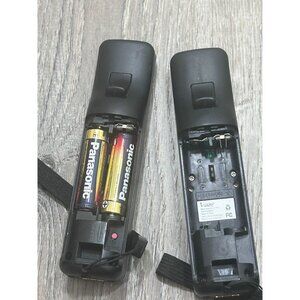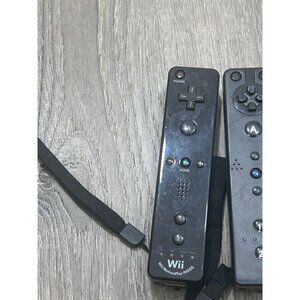 This image features two black Wii Remote controllers with built-in MotionPlus and two black Nunchuk attachments. The Wii MotionPlus technology enhances the accuracy of motion sensing, making the gaming experience more immersive. The Nunchuk controllers, attached by cables, provide an additional analog stick and buttons for advanced game control. These accessories are essential for many games on the Nintendo Wii system, offering precise input for various gaming styles.