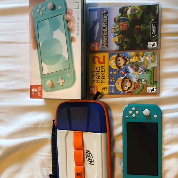Used twice comes with super Mario maker 2, Minecraft, nerf carrying case, and a charger with the console