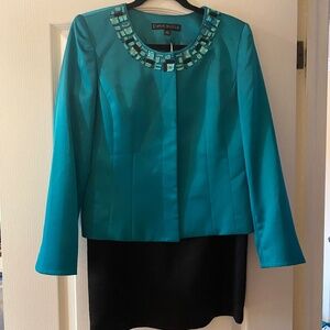 Nipon Boutique Petite, Skirt Suit, size 8, Emerald Green and Black, with gems stones, little black skirt
