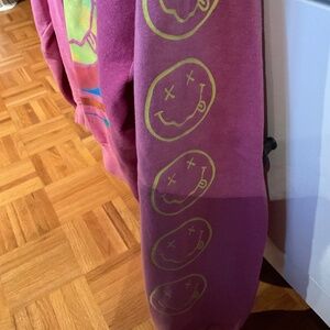 Yellow lettering on front of sweatshirt & yellow smiley faces on left sleeve