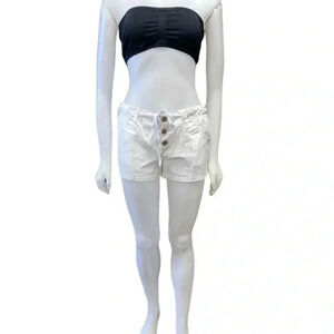 All white with a button fly and drawstring, these shorts feature four pockets and faux wooden buttons. Very little stretch available.